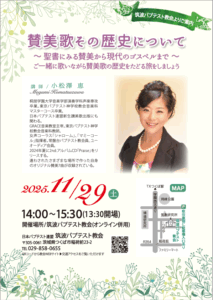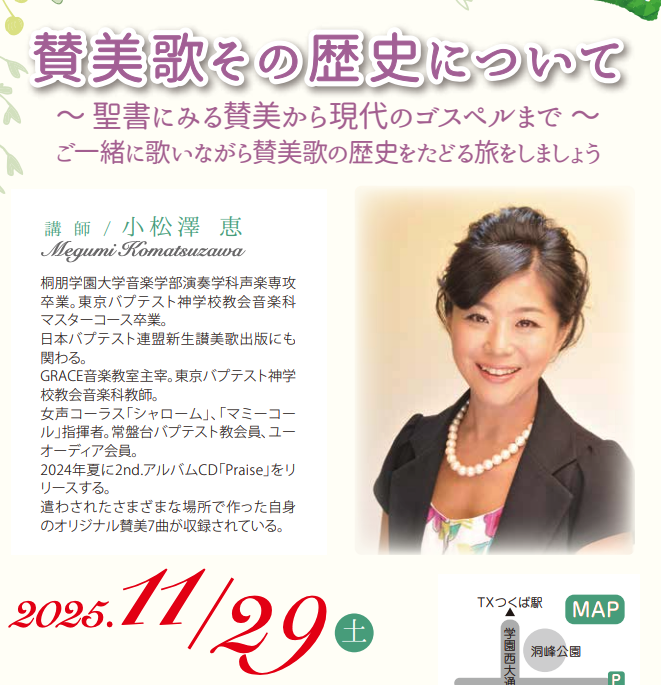 30Oct2025 11/29 賛美歌講演会&コンサート(筑波バプテスト教会) 賛美歌その歴史について ~ 聖書にみる賛美から現代のゴスペルまで ~ 講 師:小松澤 恵 日時:2025.11.29(土)14:00~15:30(13:30開場) 開催場所:筑波バプテスト教会(オンライン併用) 〒305-0061 茨城県つくば市稲荷前23-2 TEL 029-858-0655 チラシPDF 賛美歌講演会&コンサート 第76回 キリスト教視聴覚教育講習会(2025)報告 最近のお知らせ一覧お知らせ一覧 第76回 キリスト教視聴覚教育講習会(2025)報告 2025.10.09 ユーオディア 感謝コンサート&交わり会 2025.09.28 今後の出演予定 2025.05.19 クリスマスコンサート情報(中国・四国) 2024.12.02 ホームページリニューアル 2024.07.19